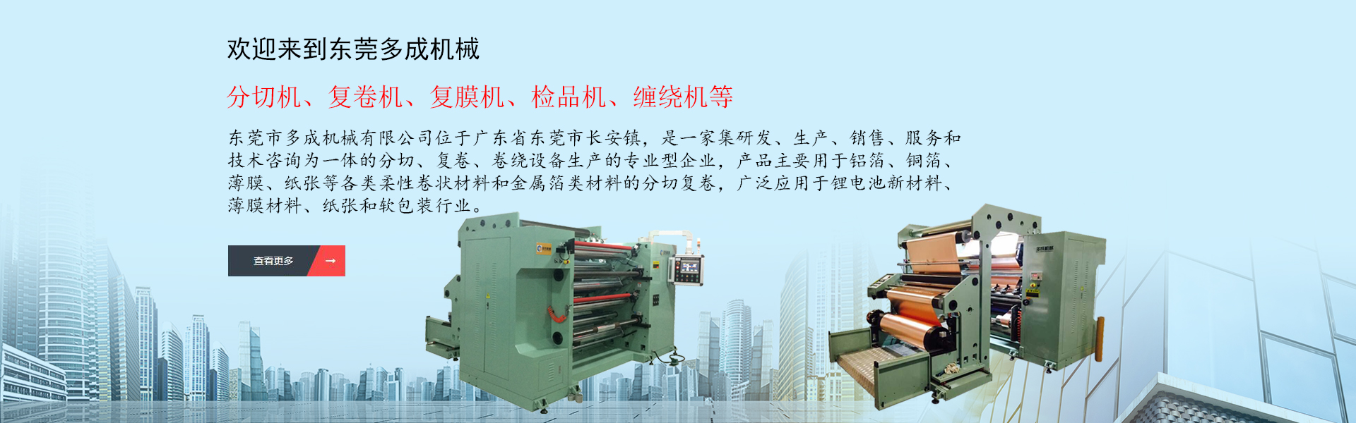 東莞市多成機(jī)械有限公司位于廣東省東莞市長(zhǎng)安鎮(zhèn),是一家集研發(fā)、生產(chǎn)、銷售、服務(wù)和技術(shù)咨詢?yōu)橐惑w的分切、復(fù)卷、卷繞設(shè)備生產(chǎn)的專業(yè)型企業(yè),產(chǎn)品主要用于鋁箔、銅箔、薄膜、紙張等各類柔性卷狀材料和金屬箔類材料的分切復(fù)卷,廣泛應(yīng)用于鋰電池新材料、薄膜材料、紙張和軟包裝行業(yè),產(chǎn)品范圍有分切機(jī)、復(fù)卷機(jī)、復(fù)膜機(jī)、檢品機(jī)、纏繞機(jī)等,是國(guó)內(nèi)外分切卷繞設(shè)備專業(yè)供應(yīng)商。